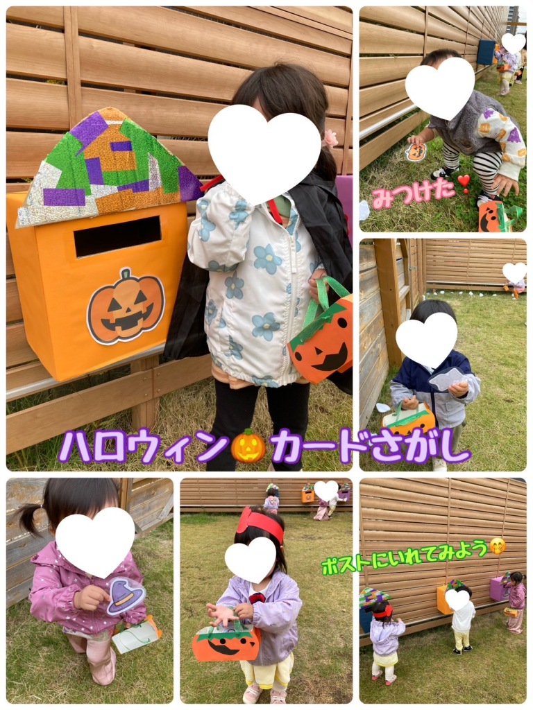 おやつのあとは、カボチャバッグを持って園庭に出るとハロウィンカードやポストが🤩