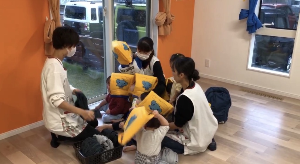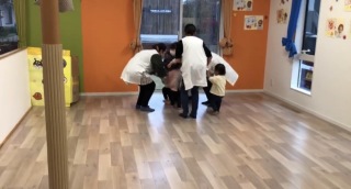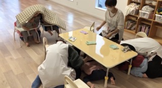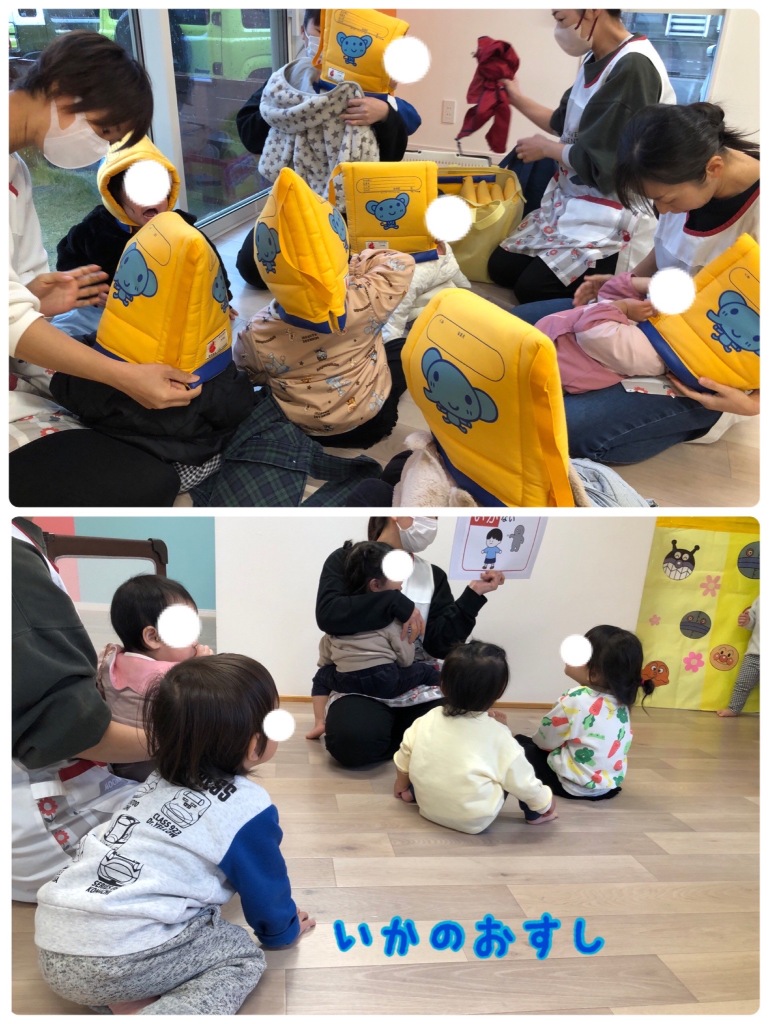2025.11.23 【第六保育園】避難訓練 おやつ前の時間に地震の避難訓練を行いました。 頭を守るため、1.2歳児は机の下に入り、0歳児はラックに座っているので布団を被せて頭を守りました。 初めて机の下に入って頭を守ったため、泣いてしまう子や、入るのを抵抗している子が多くいました。 遊びの中で机の下に入り、頭を守るダンゴムシポーズを身につけて抵抗をなくしていきたいと思います。 また、“いかのおすし“のスケッチブックシアターもよく見ていました👀