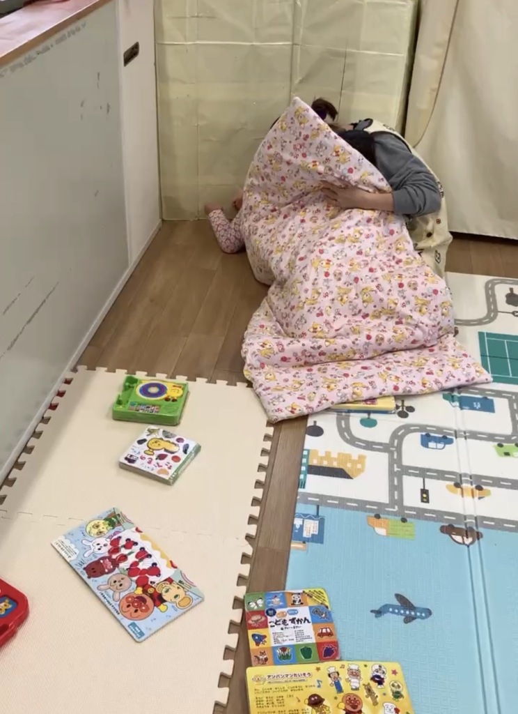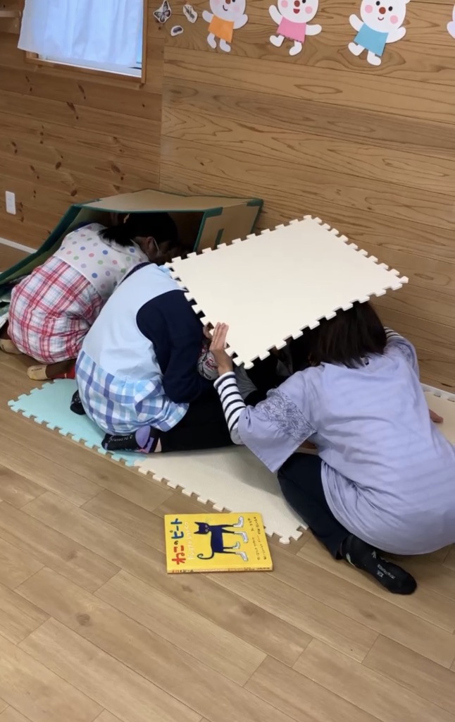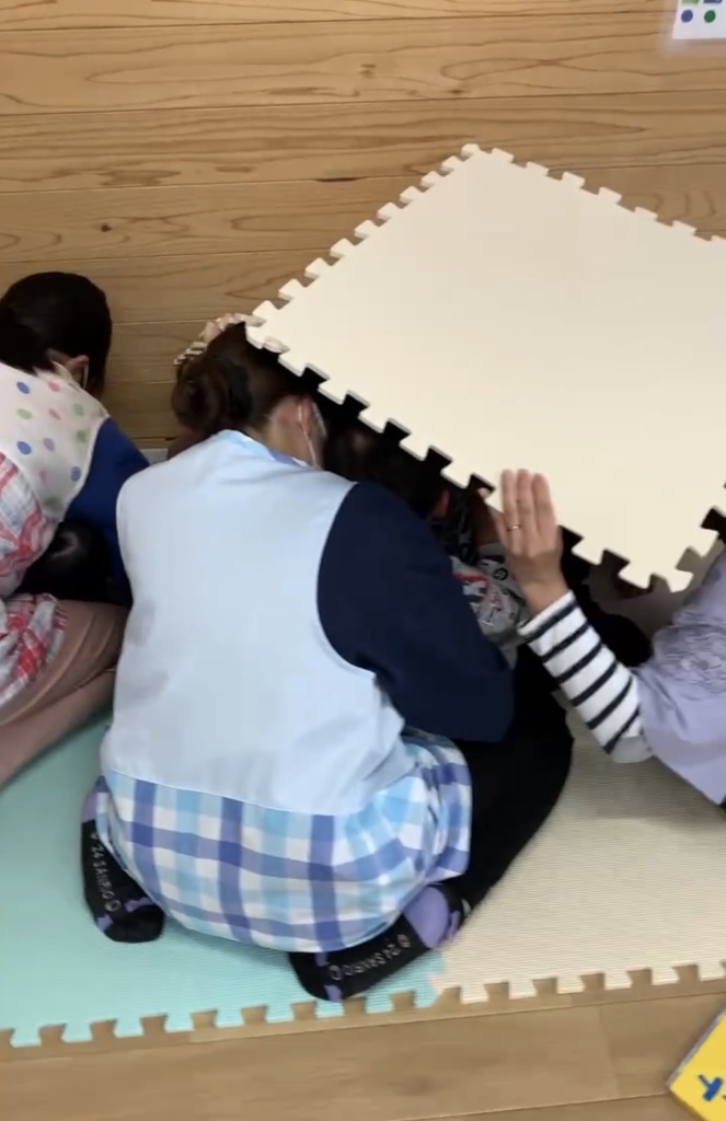 2025.11.25 【第四保育園】避難訓練 昼食前の時間に地震の避難訓練を行いました。 頭を守るため、1.2歳児はシェイクアウト、0歳児は布団を被せました。 泣いてしまう子もいましたが、保育者の話を一生懸命に聞いてくれました。 以前地震の紙芝居を見たときに出てきたダンゴムシポーズを覚えていた子もいました。 防災頭巾を被れるようになってきましたが、まだ苦手な子もいるので、遊びに取り入れていきたいと思います。
