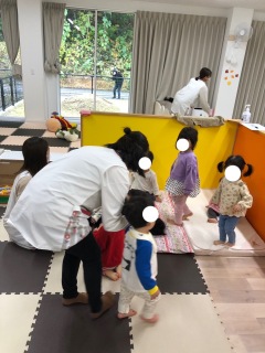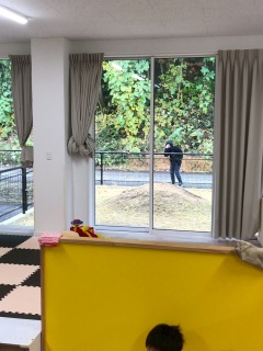 自由遊びをしている時に園庭外側から不審な人がのぞいているという設定で行い、見つけた職員が合言葉を伝え、子ども達と外から見えない場所へ集まりました。
