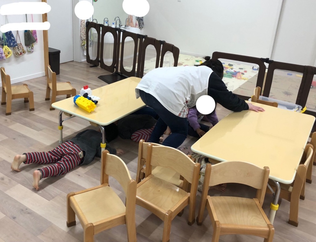 2025.12.19 【第七保育園】 自由遊びの際に地震が発生したことを想定した訓練を行いました。 保育者の声かけですぐに集まり、テーブルの下に潜ったり、布団を被ったりして待つことができました。 その後、すぐに園庭に出られる場所に移動し、防寒具を着ました。 戸惑う様子もなく落ち着いて身支度をしたり、スムーズに防災頭巾を被ることができました。 1、2歳児は頭巾の被り方を伝えるとよく話を聞き、被る練習をしていました。 職員数が少ない中で動きを確認できよい機会でした。