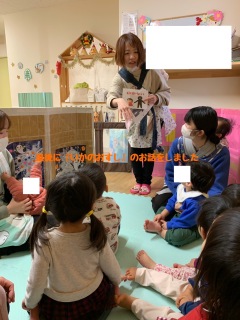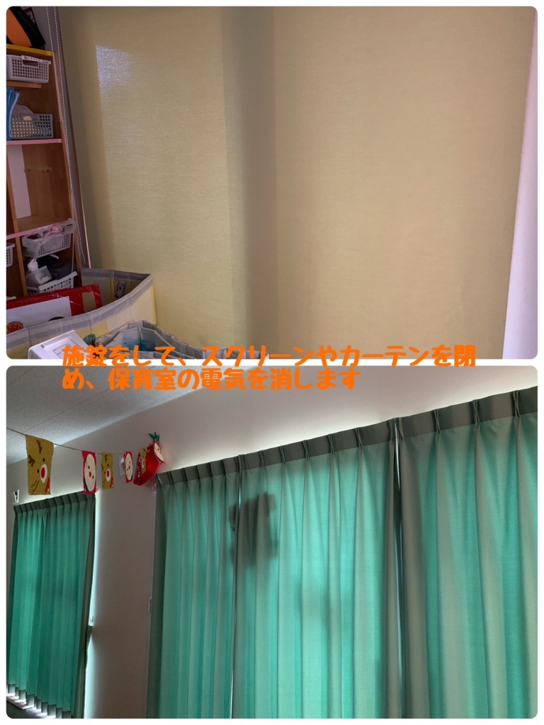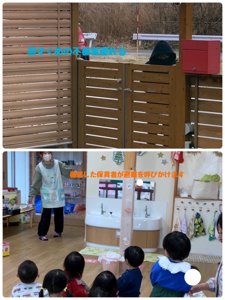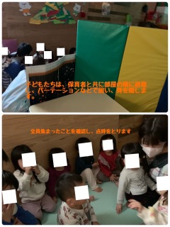 2025.12.24 【第四保育園】避難訓練 0歳児は午前おやつ後1、2歳児は午前おやつ前に、不審者が園外に現れた想定で避難訓練を行いました。 鳴り続けるインターホンや、暗い保育室に涙が出てしまった子もいましたが、保育者の声掛けや抱っこなどで安心し、すぐに泣き止み落ち着いて避難をすることができました。 避難する際に、おしゃべりする姿も見られたため、訓練の大切さをこれからも伝えていきたいと思います。
