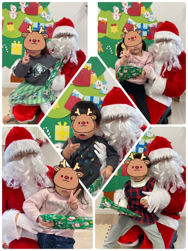 サンタさんからプレゼントを貰うと「ありがとう!」と嬉しそうなお友だち、ハイタッチするお友だち、びっくりして泣いてしまうお友だちなど、みんなのいろいろな表情を見ることができました👀✨