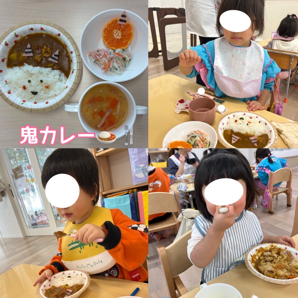 給食は可愛いカレーの鬼ランチ🍛「かわいい😍」「つのだー」と喜んで食べていました😋