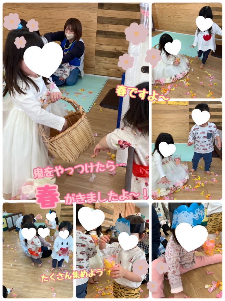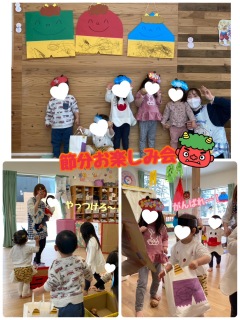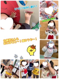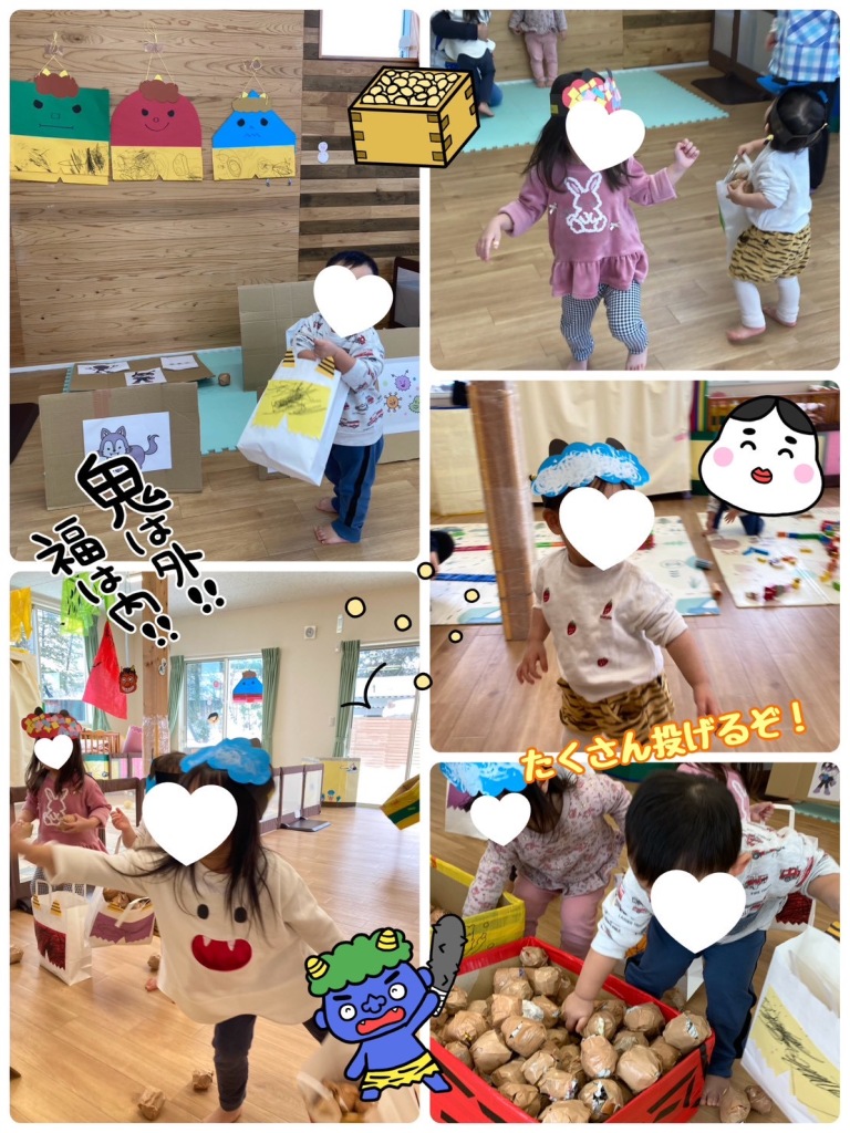 鬼やバイキンマンの的に元気いっぱい「おにはそとー!」と豆を投げた子どもたちです✨