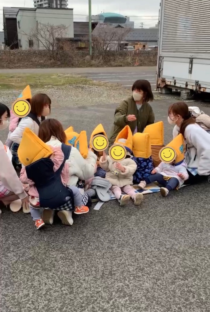 園庭にいる1、2歳児は保育者の声掛けで頭を守る姿勢(ダンゴムシポーズ)をとり、揺れがおさまった後、スムーズに表駐車場に避難することができました。