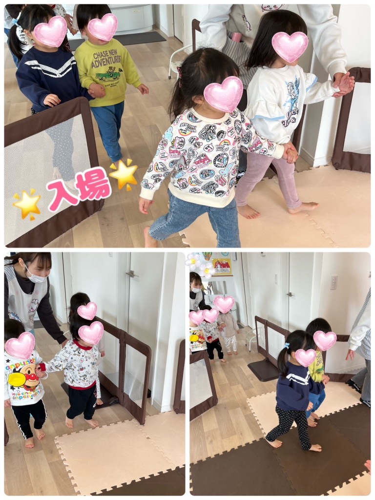 お別れ会が始まると、転園するお友だちが「にじのむこうに」の歌に合わせて、手を繋いで仲良く入場🤝
